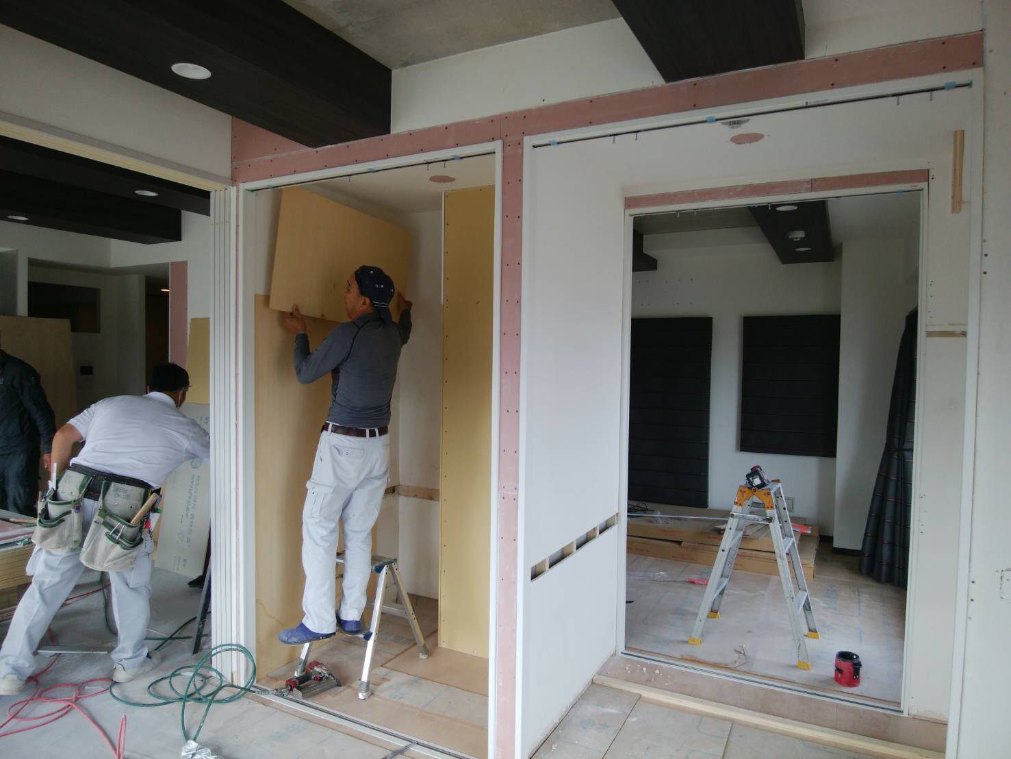 収納がたくさんできるよう、今は新しく壁となる部分にボードを貼っています。